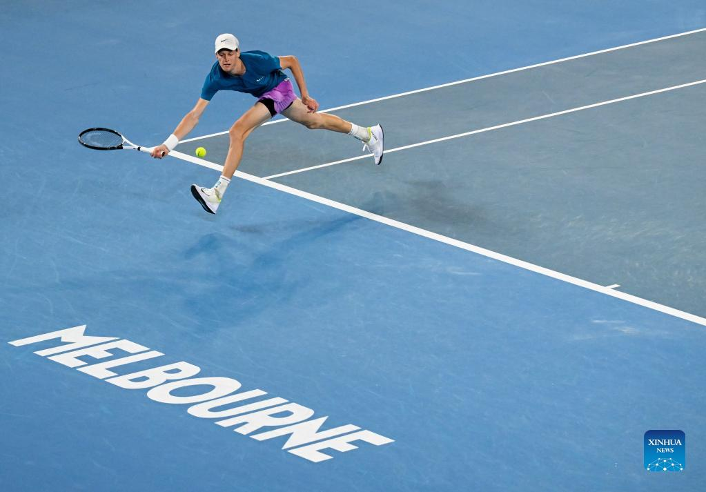 Jannik Sinner of Italy returns a shot during the men's singles 4th round match against Stefanos Tsitsipas of Greece at Australian Open in Melbourne Park in Melbourne, Australia, Jan. 22, 2023. (Xinhua/Guo Lei)
