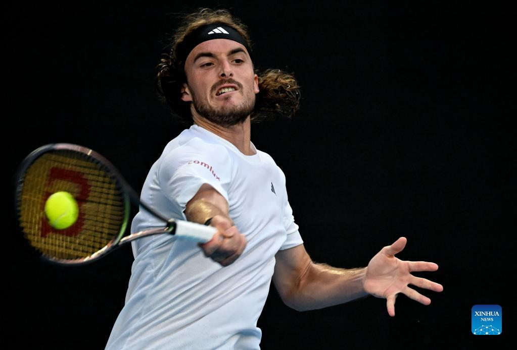Stefanos Tsitsipas of Greece returns a shot during the men's singles 4th round match against Jannik Sinner of Italy at Australian Open in Melbourne Park in Melbourne, Australia, Jan. 22, 2023. (Xinhua/Guo Lei)