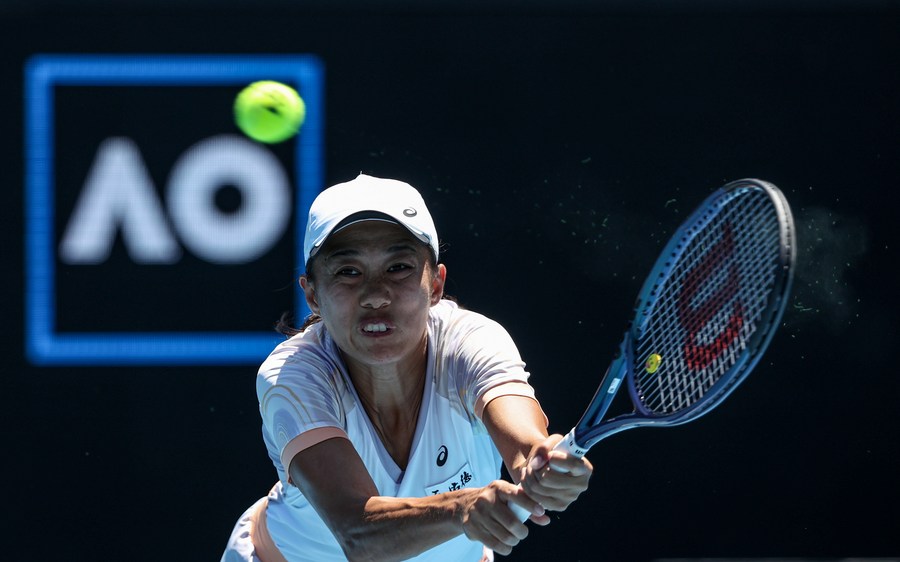 Zhang Shuai of China hits a return during the women's singles 4th round match against Karolina Pliskova of the Czech Republic at the Australian Open in Melbourne Park, in Melbourne, Australia, Jan. 23, 2023. (Xinhua/Bai Xuefei)