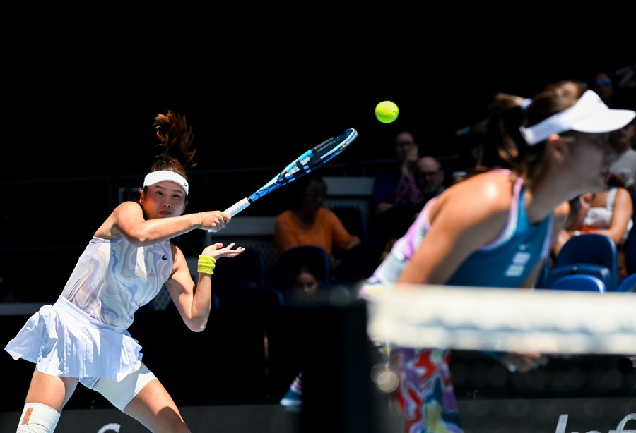 Yang Zhaoxuan (L) /Chan Hao-ching in action during their women's doubles third round match against Anhelina Kalinina/Alison Van Uytvanck at the Australian Open in Melbourne Park, in Melbourne, Australia, Jan. 23, 2023. (Xinhua/Guo Lei)