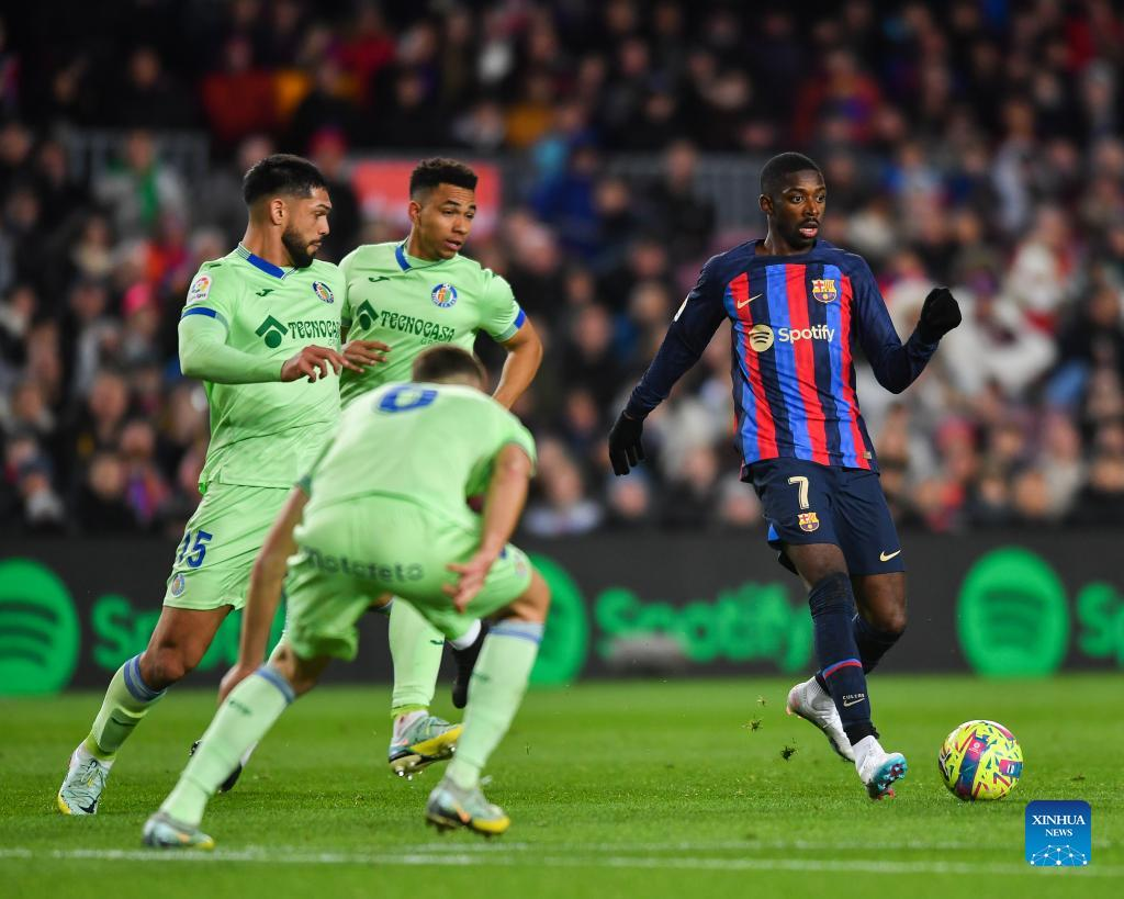 Ousmane Dembele (1st R) of Barcelona tries to break through during a Spanish La Liga football match between Barcelona and Getafe CF in Barcelona, Spain, Jan. 22, 2023. (Photo by Joan Gosa/Xinhua)