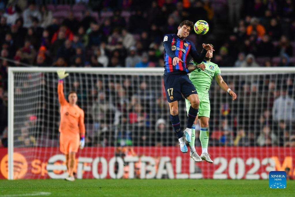 Marcos Alonso (L, Top) of Barcelona vies with Portu of Getafe CF during a Spanish La Liga football match between Barcelona and Getafe CF in Barcelona, Spain, Jan. 22, 2023. (Photo by Joan Gosa/Xinhua)