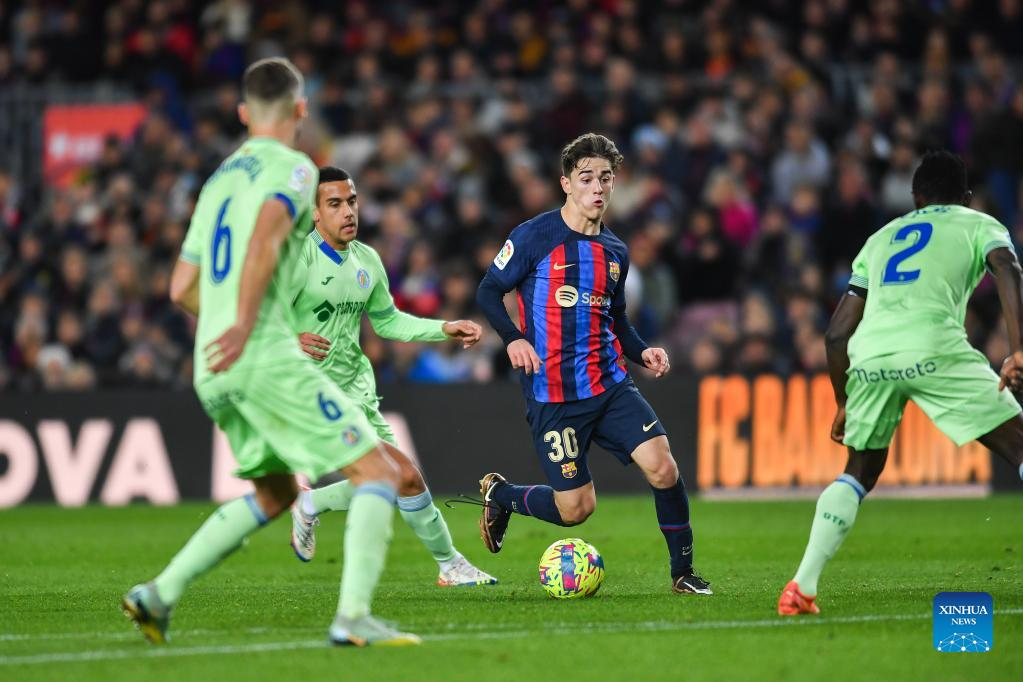 Gavi (2nd R) of Barcelona tries to break through during a Spanish La Liga football match between Barcelona and Getafe CF in Barcelona, Spain, Jan. 22, 2023. (Photo by Joan Gosa/Xinhua)