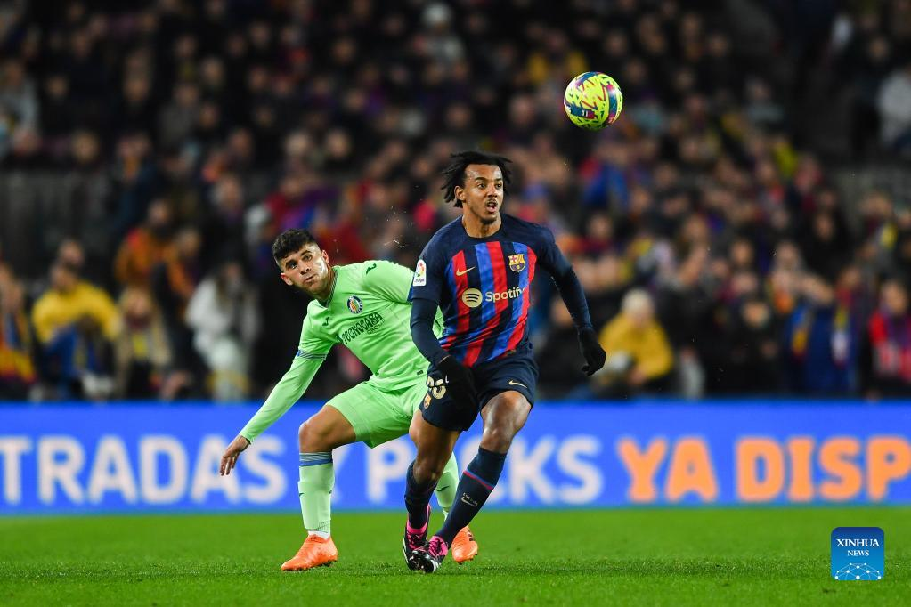Jules Kounde (R) of Barcelona vies with Alena of Getafe CF during a Spanish La Liga football match between Barcelona and Getafe CF in Barcelona, Spain, Jan. 22, 2023. (Photo by Joan Gosa/Xinhua)
