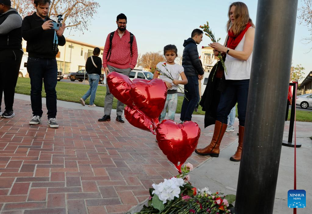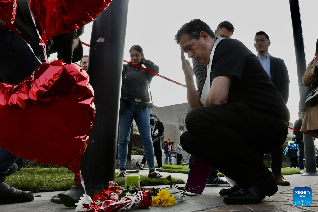 People mourn for victims of a mass shooting in front of the city hall of Monterey Park, California, the United States, Jan. 22, 2023. Five women and five men were killed while another 10 people were injured in a mass shooting in the city of Monterey Park, 16 km east of Los Angeles downtown, the authorities said Sunday. (Xinhua)