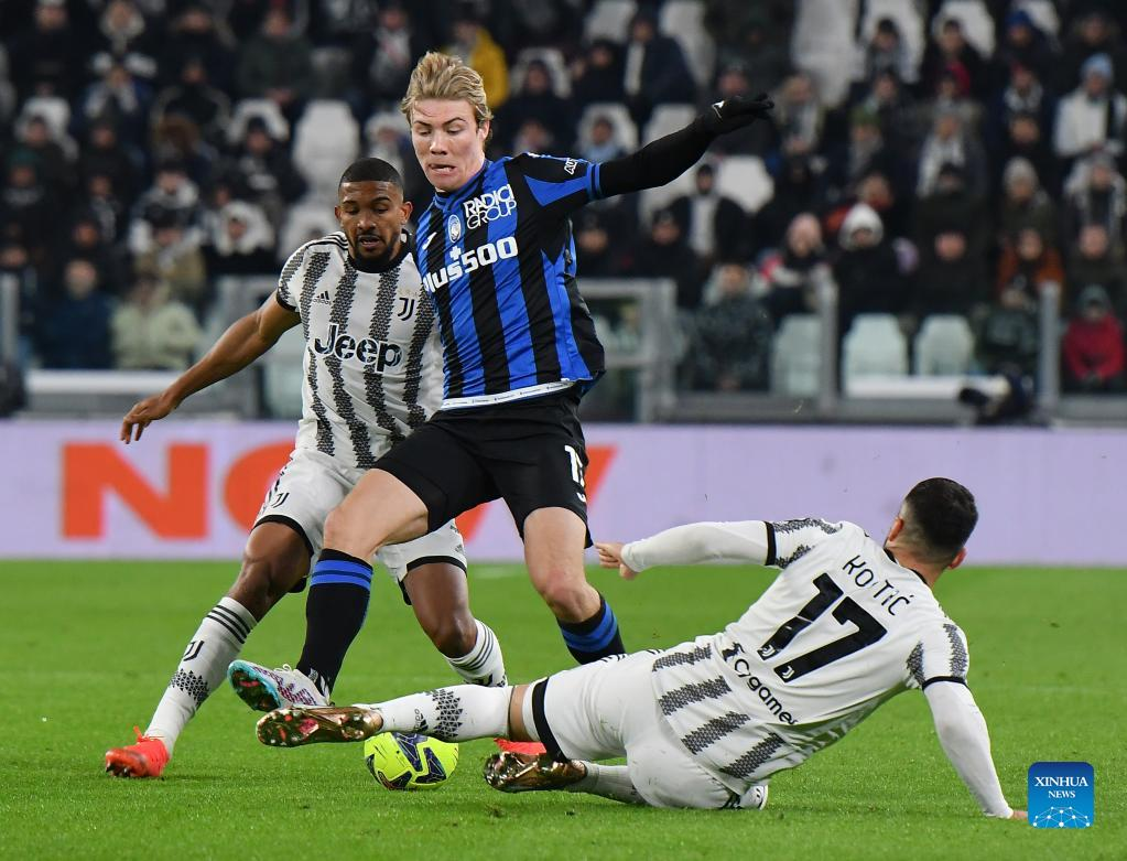 FC Juventus' Bremer (L) and Filip Kostic (R) vie with Atalanta's Rasmus Hojlund during a Serie A football match between FC Juventus and Atalanta in Turin, Italy, on Jan. 22, 2023. (Photo by Federico Tardito/Xinhua)