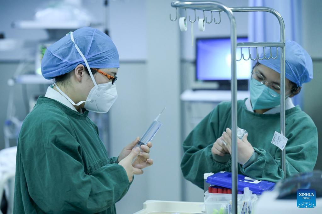 Medical staff check the condition of a patient at the intensive care unit of Guangdong Provincial Hospital of Chinese Medicine in Guangzhou, south China's Guangdong Province, Jan. 21, 2023. Medical staff stick to their posts during the Spring Festival holiday. (Xinhua/Deng Hua)