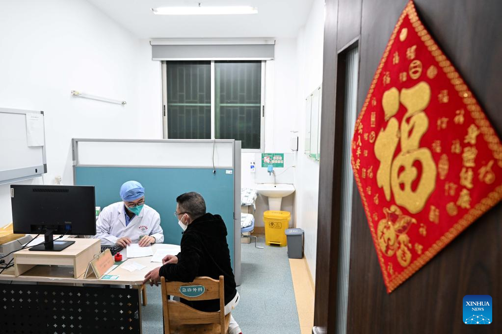 A medical worker checks the condition of a patient at the emergency department of the Second Affiliated Hospital of Anhui Medical University in Hefei, east China's Anhui Province, Jan. 21, 2023. Medical staff stick to their posts during the Spring Festival holiday. (Xinhua/Zhou Mu)