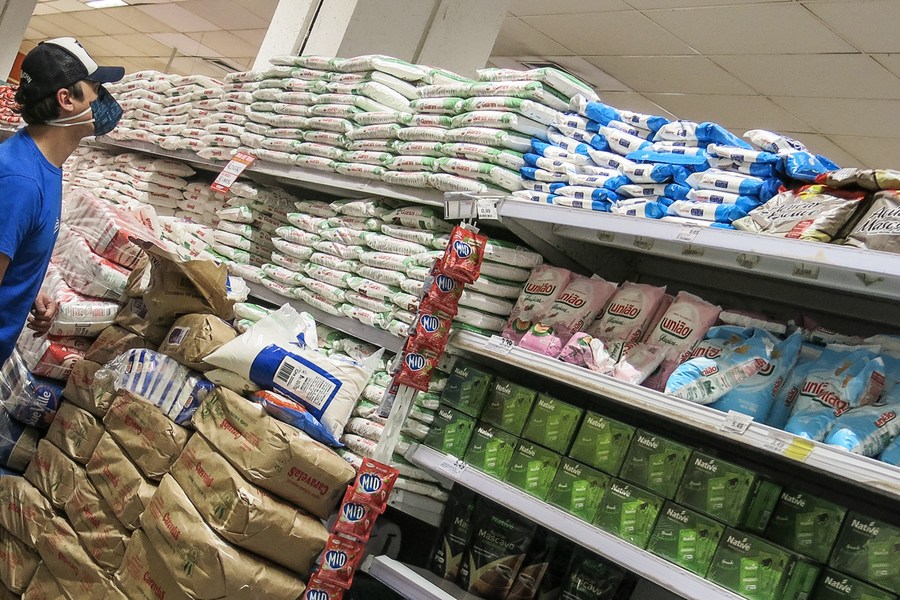 A customer buys goods at a supermarket in Sao Paulo, Brazil, March 18, 2020. (Photo by Rahel Patrasso/Xinhua)