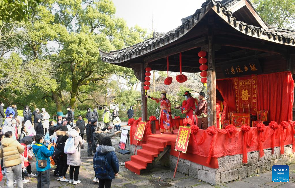 Tourists watch a traditional wedding ceremony performance at Xixi National Wetland Park in Hangzhou, capital of east China's Zhejiang Province, Jan. 24, 2023. Various activities were held here to celebrate the Chinese Lunar New Year. (Xinhua/Weng Xinyang)
