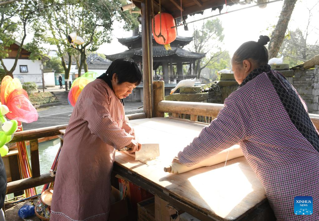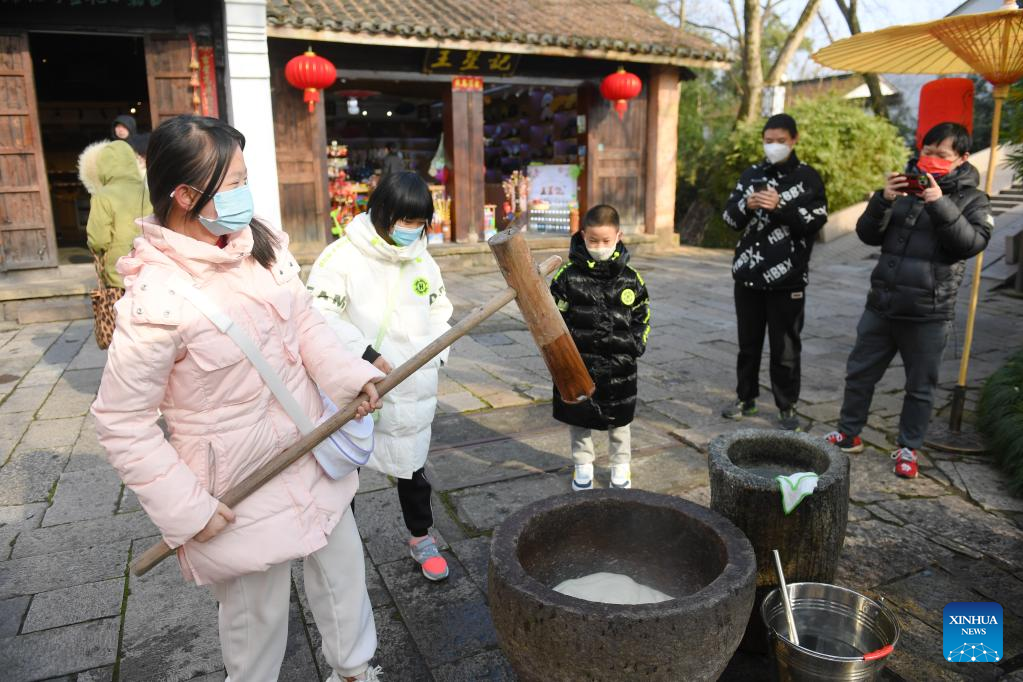 Tourists help make sticky rice cake at Xixi National Wetland Park in Hangzhou, capital of east China's Zhejiang Province, Jan. 24, 2023. Various activities were held here to celebrate the Chinese Lunar New Year. (Xinhua/Weng Xinyang)