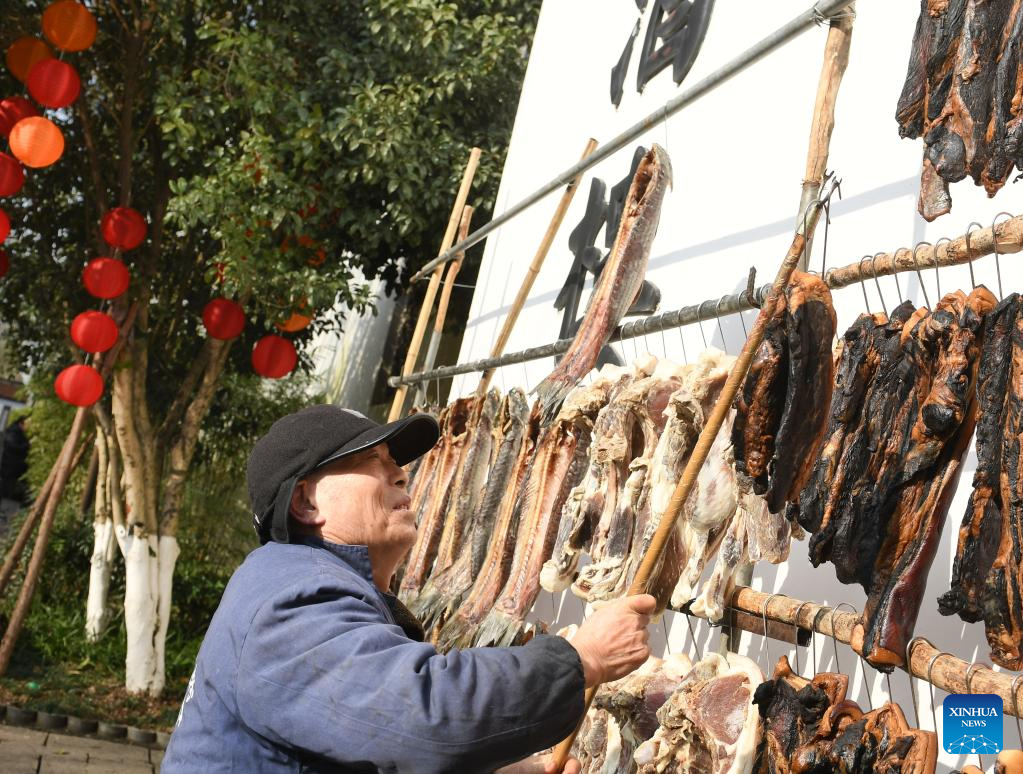 A staff member of a restaurant dries meat at Xixi National Wetland Park in Hangzhou, capital of east China's Zhejiang Province, Jan. 24, 2023. Various activities were held here to celebrate the Chinese Lunar New Year. (Xinhua/Weng Xinyang)