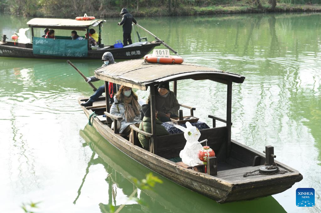 Tourists take a boat decorated with a rabbit-shaped lantern visiting Xixi National Wetland Park in Hangzhou, capital of east China's Zhejiang Province, Jan. 24, 2023. Various activities were held here to celebrate the Chinese Lunar New Year. (Xinhua/Weng Xinyang)