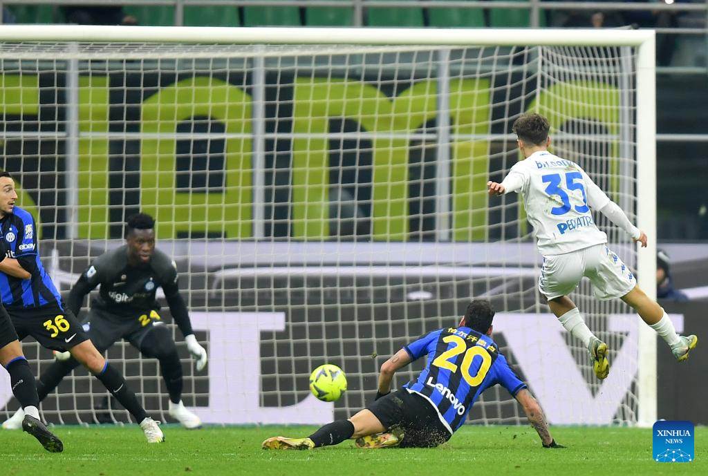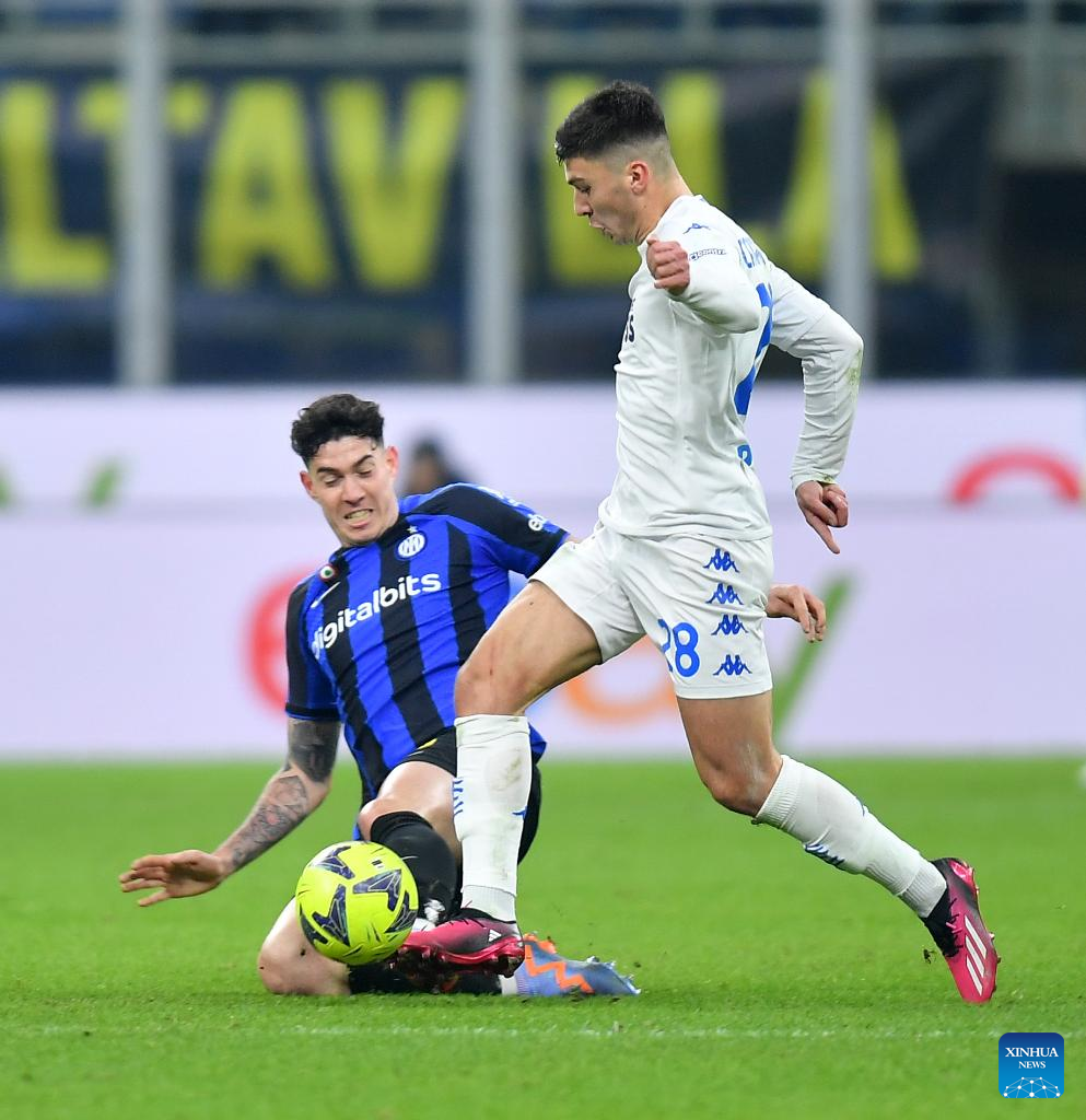 Empoli's Tommaso Baldanzi (R) scores during a Serie A football match between Inter Milan and Empoli in Milan, Italy, Jan. 23, 2023. (Photo by Daniele Mascolo/Xinhua)