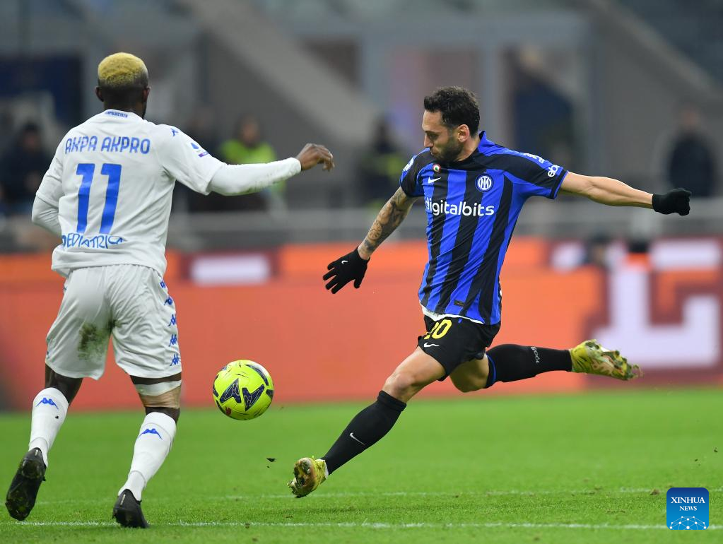 Inter Milan's Hakan Calhanoglu (R) competes during a Serie A football match between Inter Milan and Empoli in Milan, Italy, Jan. 23, 2023. (Photo by Daniele Mascolo/Xinhua)