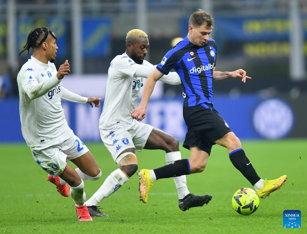 Inter Milan's Nicolo Barella (R) vies with Empoli's Akpa Akpro (C) and Tyronne Ebuehi during their Serie A football match between Inter Milan and Empoli in Milan, Italy, Jan. 23, 2023. (Photo by Daniele Mascolo/Xinhua)