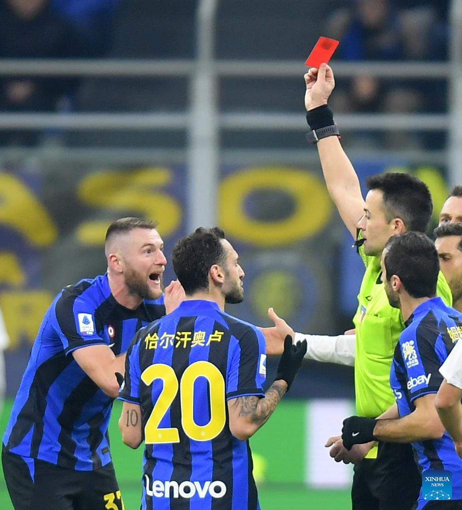 Inter Milan's Milan Skriniar (L) receives a red card from the referee during a Serie A football match between Inter Milan and Empoli in Milan, Italy, Jan. 23, 2023. (Photo by Daniele Mascolo/Xinhua)
