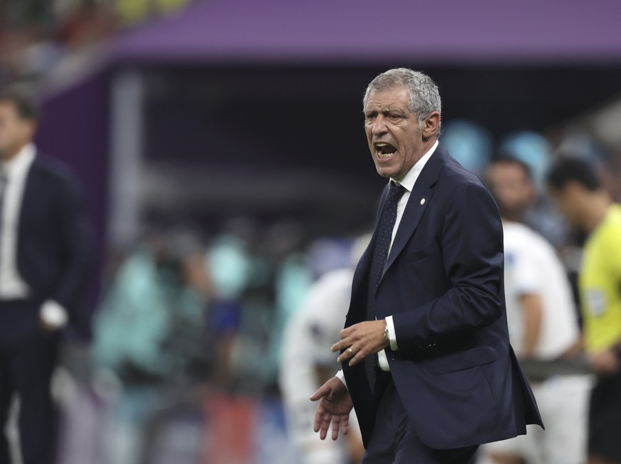 Fernando Santos, head coach of Portugal, reacts during the Group H match against Uruguay at the 2022 FIFA World Cup at Lusail Stadium in Lusail, Qatar, Nov. 28, 2022. (Xinhua/Cao Can)