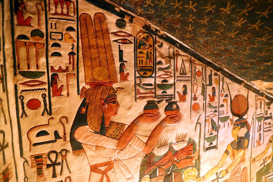 Photo taken on Jan. 24, 2023 shows the mural paintings inside the tomb of Nefertari at the Valley of the Queens in Luxor, Egypt. (Xinhua/Sui Xiankai)