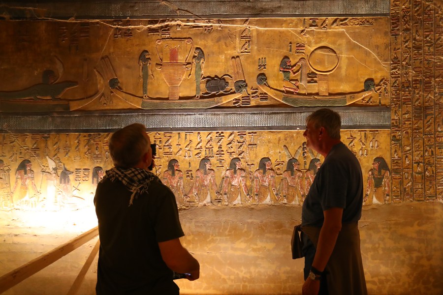 Tourists visit the tomb of King Seti I at the Valley of the Kings in Luxor, Egypt, on Jan. 24, 2023. The tomb of King Seti I (1314-1304 BC) is famous for its well-preserved colorful relief paintings. (Xinhua/Sui Xiankai)