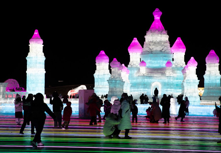 People have fun at Harbin Ice and Snow World in Harbin, northeast China's Heilongjiang Province, Jan. 24, 2023. (Xinhua/Zhang Tao)