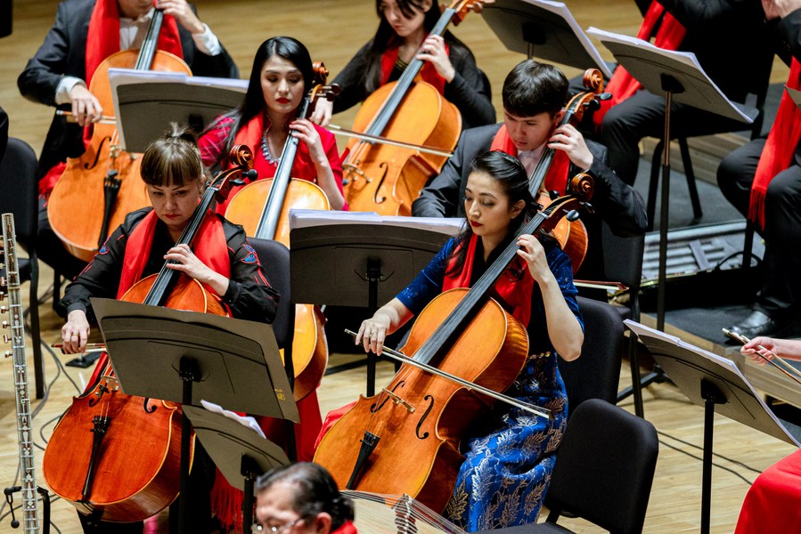 This photo taken on Jan. 14, 2023 shows the Chinese Lunar New Year concert presented by Xinjiang Art Theater's folk orchestra in Urumqi, northwest China's Xinjiang Uygur Autonomous Region. (Xinhua)