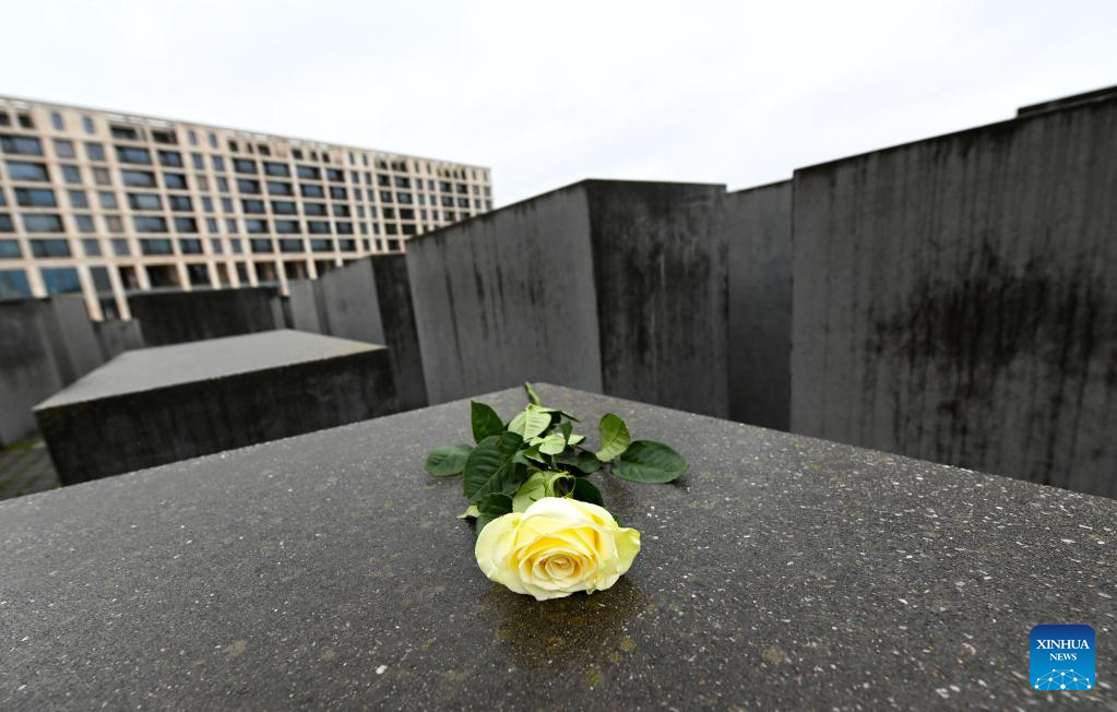 A flower is seen at the Memorial to the Murdered Jews of Europe in Berlin, Germany, Jan. 27, 2023. The memorial, located in the center of Berlin, was built to remember about 6 million Jews killed by the Nazis during World War II. In 2005, the UN General Assembly adopted a resolution which designated Jan. 27 as the International Day of Commemoration in Memory of the Victims of the Holocaust. (Xinhua/Ren Pengfei)