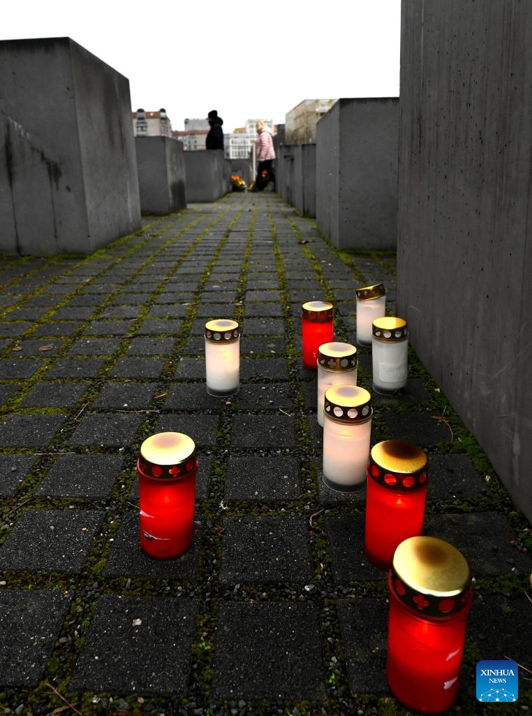 Candles are seen at the Memorial to the Murdered Jews of Europe in Berlin, Germany, Jan. 27, 2023. The memorial, located in the center of Berlin, was built to remember about 6 million Jews killed by the Nazis during World War II. In 2005, the UN General Assembly adopted a resolution which designated Jan. 27 as the International Day of Commemoration in Memory of the Victims of the Holocaust. (Xinhua/Ren Pengfei)