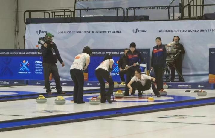 China's women's curling team competing against South Korea at the 31st Winter World University Games. (Photo courtesy of Federation of University Sports of China)