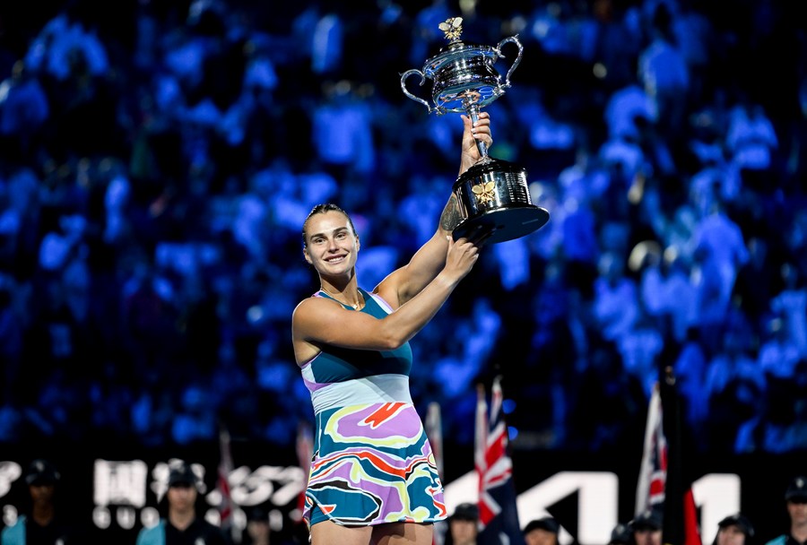 Aryna Sabalenka poses with the trophy after defeating Elena Rybakina to win the women's singles title at the Australian Open tennis tournament in Melbourne, Jan. 28, 2023. (Xinhua/Guo Lei)