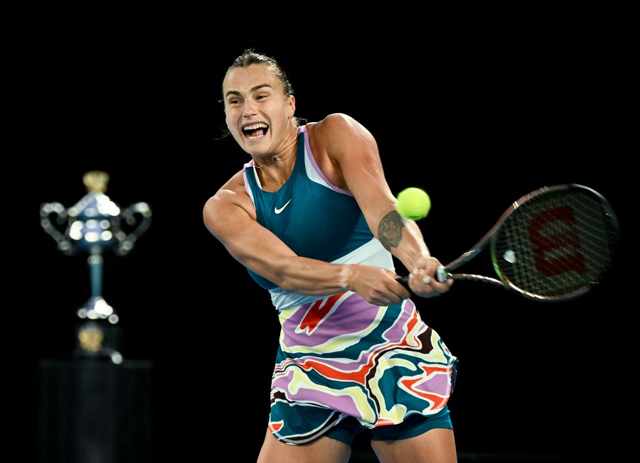 Sabalenka hits a return during the final. (Xinhua/Guo Lei)