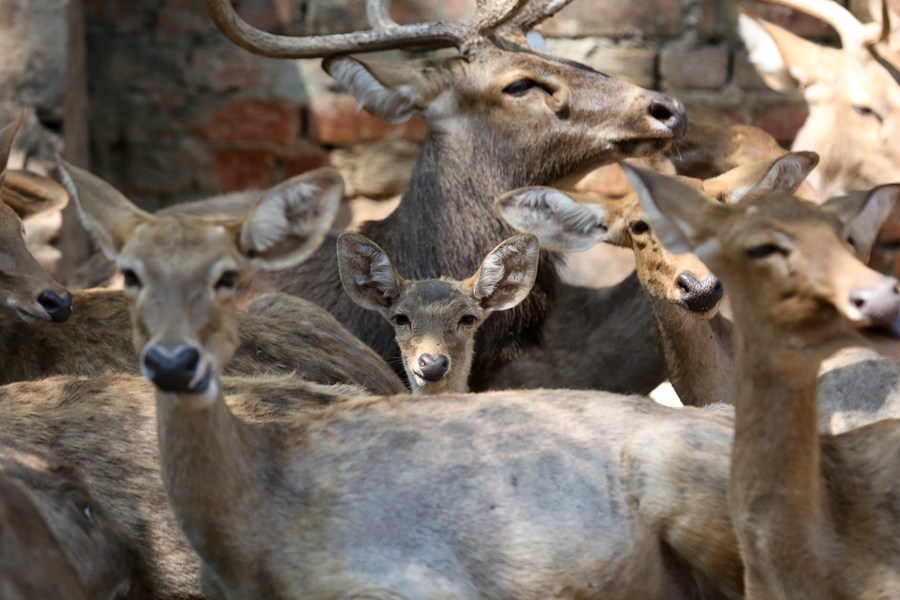 Eld's deers are seen at the Zoological Gardens in Yangon, Myanmar on Jan. 28, 2023. (Photo by Myo Kyaw Soe/Xinhua)