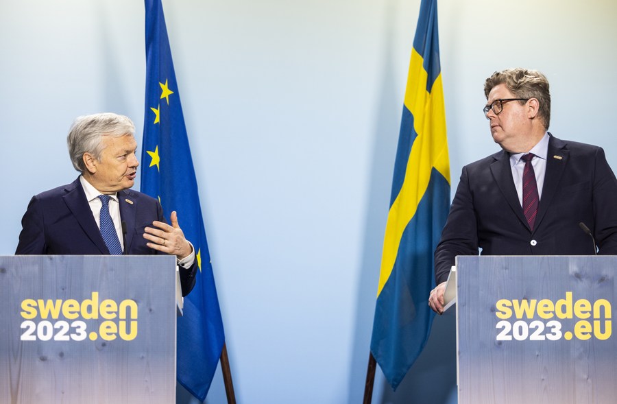 European Commissioner for Justice Didier Reynders (L) and Swedish Minister for Justice Gunnar Strommer attend a press conference in Stockholm, Sweden, on Jan. 27, 2023. (Johannes Frandsen/Government Offices of Sweden/Handout via Xinhua)