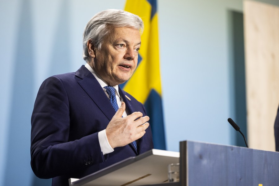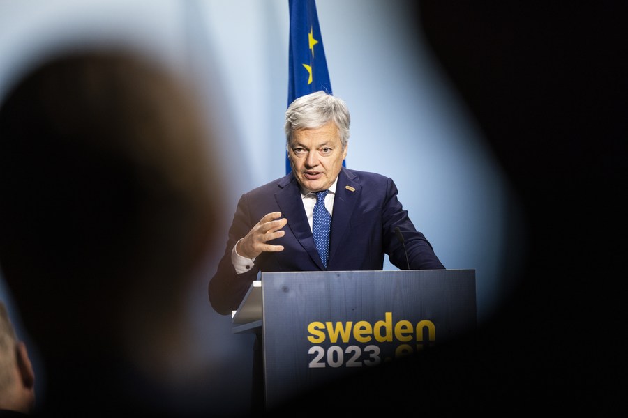 European Commissioner for Justice Didier Reynders speaks at a press conference in Stockholm, Sweden, on Jan. 27, 2023. (Johannes Frandsen/Government Offices of Sweden/Handout via Xinhua)
