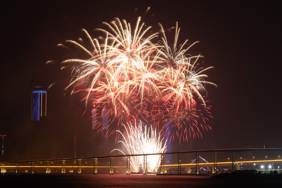 A fireworks show is staged to celebrate the Spring Festival in south China's Macao on Jan. 24, 2023. (Xinhua/Cheong Kam Ka)