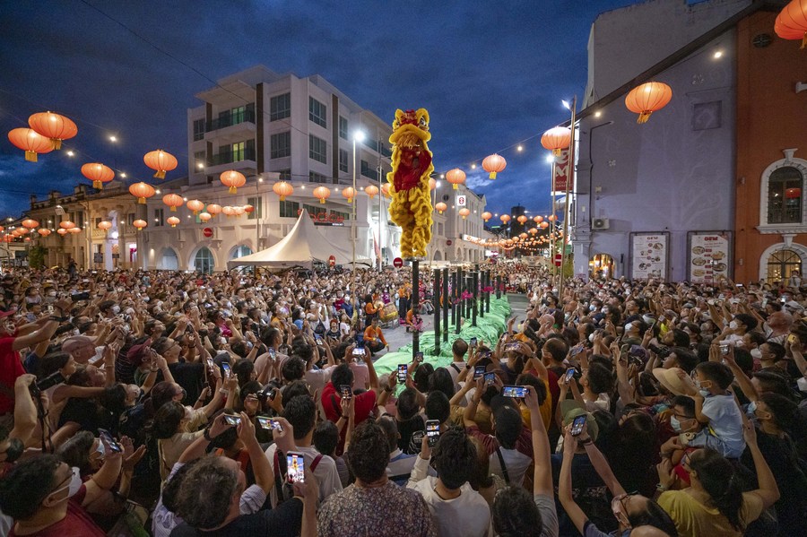 People watch a performance at the Penang CNY Celebration in George Town, Penang, Malaysia, Jan. 28, 2023. (Photo by Chong Voon Chung/Xinhua)