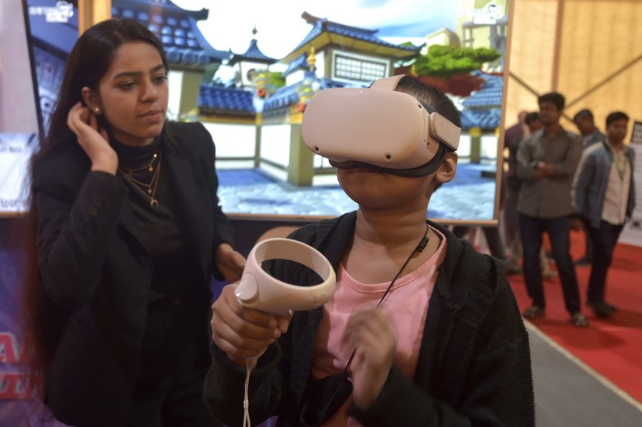 A visitor tries a virtual reality headset at Digital Bangladesh Mela (expo) in Dhaka, Bangladesh on Jan. 28, 2023. (Xinhua)