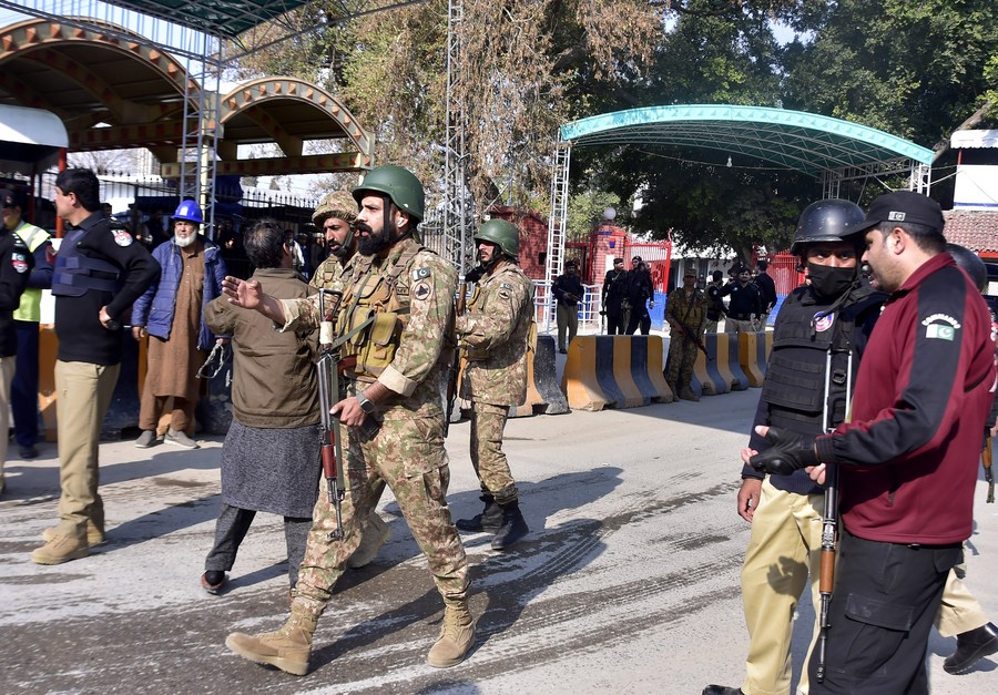 Security personnel stand guard at the blast site in northwest Pakistan's Peshawar on Jan. 30, 2023. (Photo by Saeed Ahmad/Xinhua)