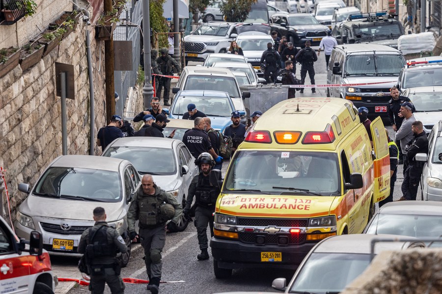 Israeli police are seen at the scene of a shooting attack near the Old City of Jerusalem, on Jan. 28, 2023. (JINI via Xinhua)