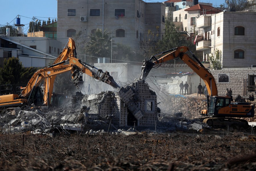 Excavators are seen demolishing a house in the West Bank city of Hebron, on Jan. 11, 2023. (Photo by Mamoun Wazwaz/Xinhua)
