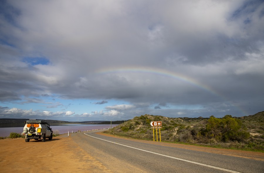 Photo taken on June 13, 2022 shows a rainbow over Hutt Lagoon in Western Australia, Australia. (Xinhua/Bai Xuefei)