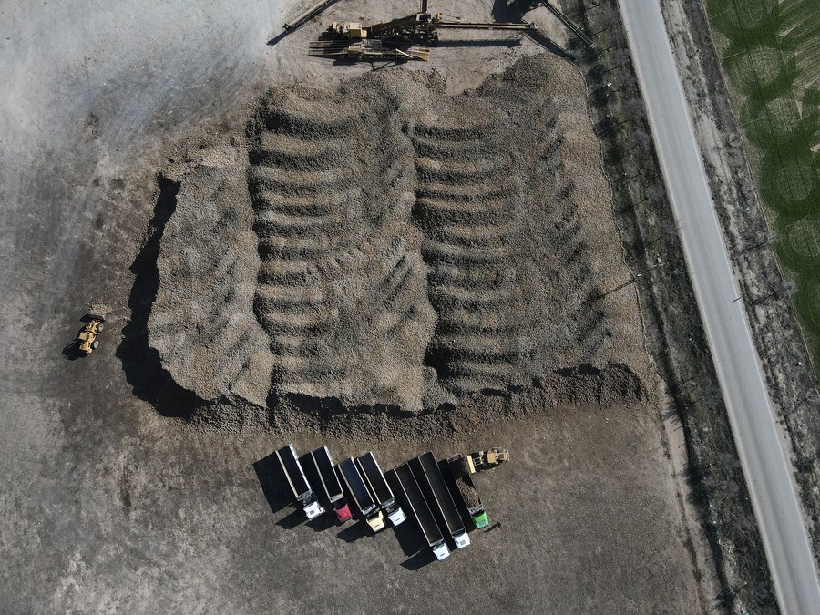 Aerial photo taken on January 19, 2023 shows sugar beets being loaded onto trucks in Konya, Türkiye. (Photo by Mustafa Kaya/Xinhua)