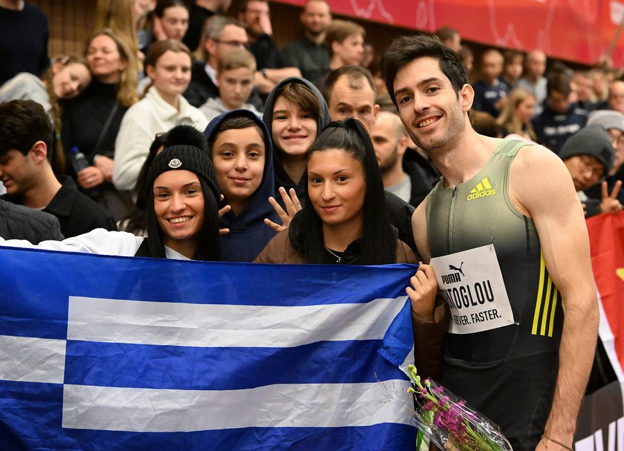 Miltiadis Tentoglou (1st R) of Greece poses with fans after the men's long jump final during the Gothenburg Games of World Athletics Indoor tour in Gothenburg, Sweden, Feb 2, 2023. (Deca Text & Bild/Handout via Xinhua)