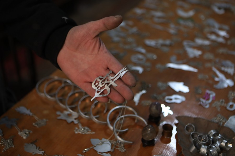 Palestinian artist Akram Al-Waara recycles tear gas canisters into art pieces at his workshop in the Aida refugee camp in the West Bank city of Bethlehem, on Feb. 2, 2023. (Photo by Mamoun Wazwaz/Xinhua)