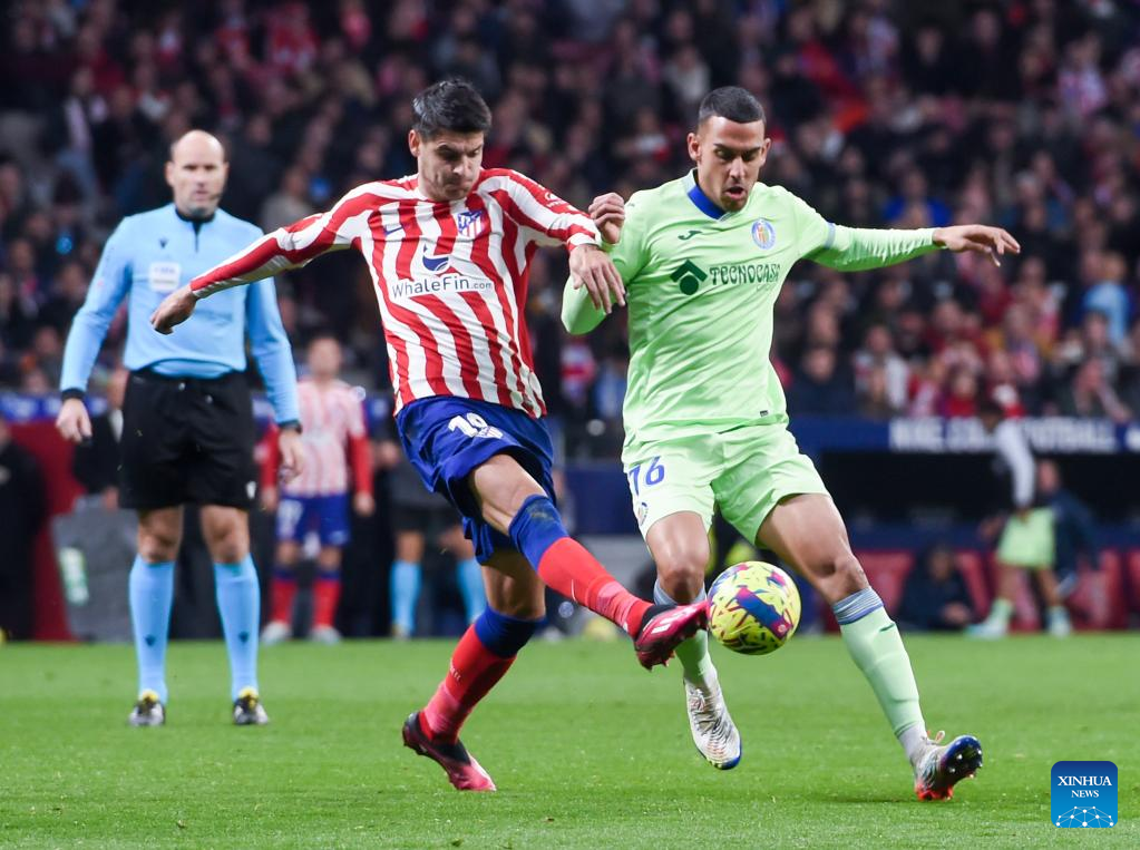 Alvaro Morata (front L) of Atletico de Madrid vies with Angel Algobia of Getafe during a Spanish La Liga football match between Atletico de Madrid and Getafe CF in Madrid, Spain, Feb. 4, 2023. (Photo by Gustavo Valiente/Xinhua)