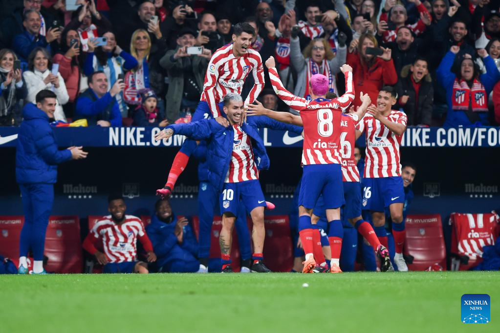 Players of Atletico de Madrid celebrate a goal during a Spanish La Liga football match between Atletico de Madrid and Getafe CF in Madrid, Spain, Feb. 4, 2023. (Photo by Gustavo Valiente/Xinhua)