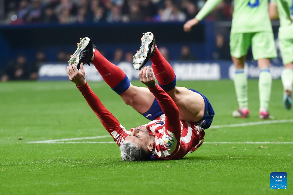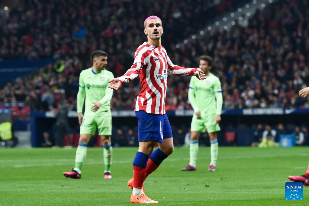 Antoine Griezmann of Atletico de Madrid reacts during a Spanish La Liga football match between Atletico de Madrid and Getafe CF in Madrid, Spain, Feb. 4, 2023. (Photo by Gustavo Valiente/Xinhua)