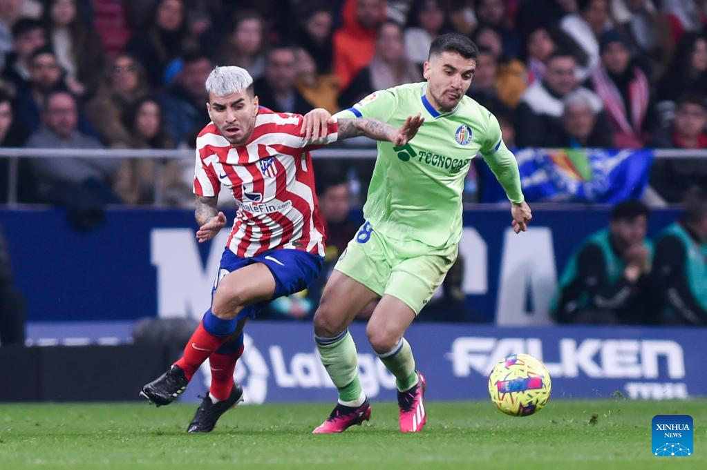 Angel Correa (L) of Atletico de Madrid vies with Mauro Arambarri of Getafe during a Spanish La Liga football match between Atletico de Madrid and Getafe CF in Madrid, Spain, Feb. 4, 2023. (Photo by Gustavo Valiente/Xinhua)
