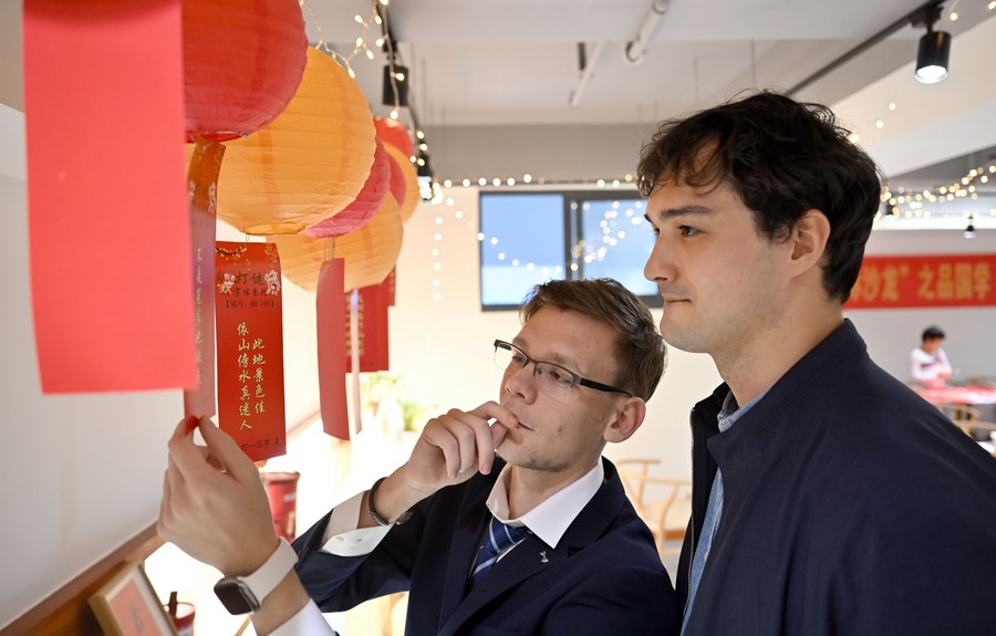 Foreigners guess lantern riddles during an event celebrating the Lantern Festival in Haikou, capital of south China's Hainan Province, on Feb. 4, 2023. (Xinhua/Guo Chen)