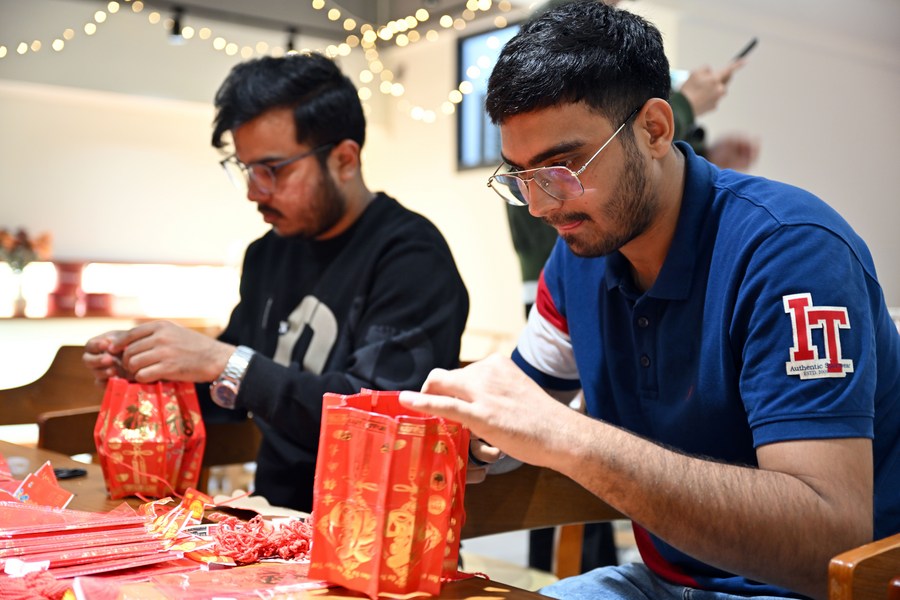HAIKOU, Feb. 5 (Xinhua) -- As the Lantern Festival was approaching, nearly twenty foreigners from different countries and regions gathered together in Haikou, capital of south China's Hainan Province. They experienced Chinese traditions including writing Chinese character Fu, making rice dumplings, making lanterns and guessing lantern riddles.
